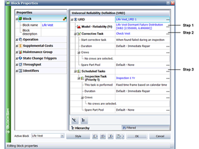 One way to approach this in BlockSim is to use a simulation diagram and set up a single block with a universal reliability definition (URD) that describes the dormant failure distribution. The following figure shows the Block Properties window for the block representing the life vest. The steps for configuring the URD are described next.