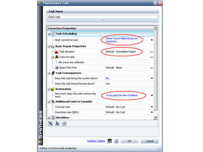 Step 2: During inspection, if a vest is found failed, it is replaced; thus a corrective task needs to be set for the block. To do this, double-click the Corrective Task field in the Universal Reliability Definition area (shown in Figure 1). This opens a Maintenance Task window that allows you to enter the details of the corrective task.