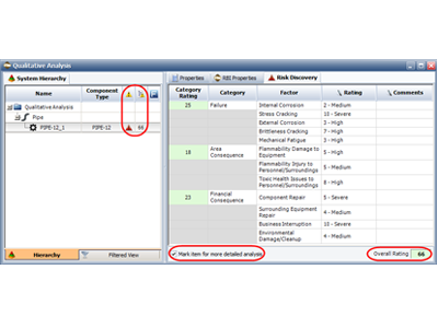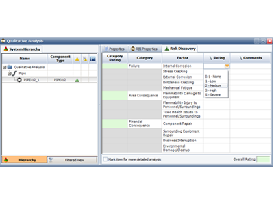 You can use the Risk Discovery analysis feature in RBI to assign ratings for a variety of different factors and then calculate an overall value for each component. If the component passes a threshold value that you determine is appropriate for your needs, you can then mark the item as being in need of further analysis.