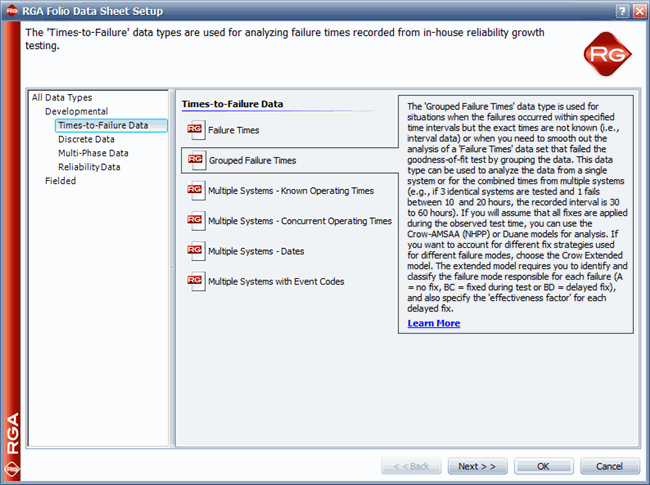A standard folio data sheet configured for grouped failure times data type is created by selecting Times-to-Failure Data > Grouped Failure Times on the first page of the RGA Folio Data Sheet Setup window and choosing Days as the units of measurement on the second page, as shown next.
