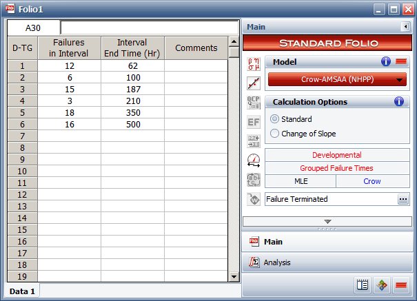 The data set is then entered and the Crow-AMSAA (NHPP) model is selected for analysis, as shown next.