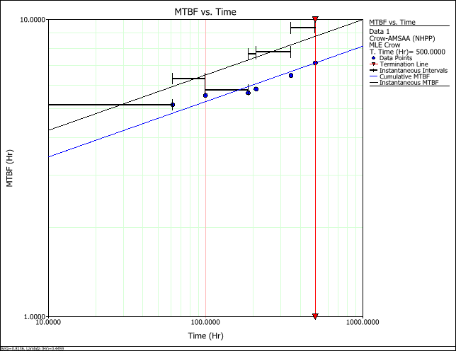A plot of the MTBF vs. time is shown next. The plot shows the mean time between failures plotted against time. The horizontal lines represent the instantaneous MTBF over the marked interval. The points represent actual failures in the data set.
