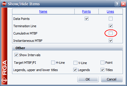 Figure 6: Show/Hide Items window with cleared option for cumulative MTBF line.