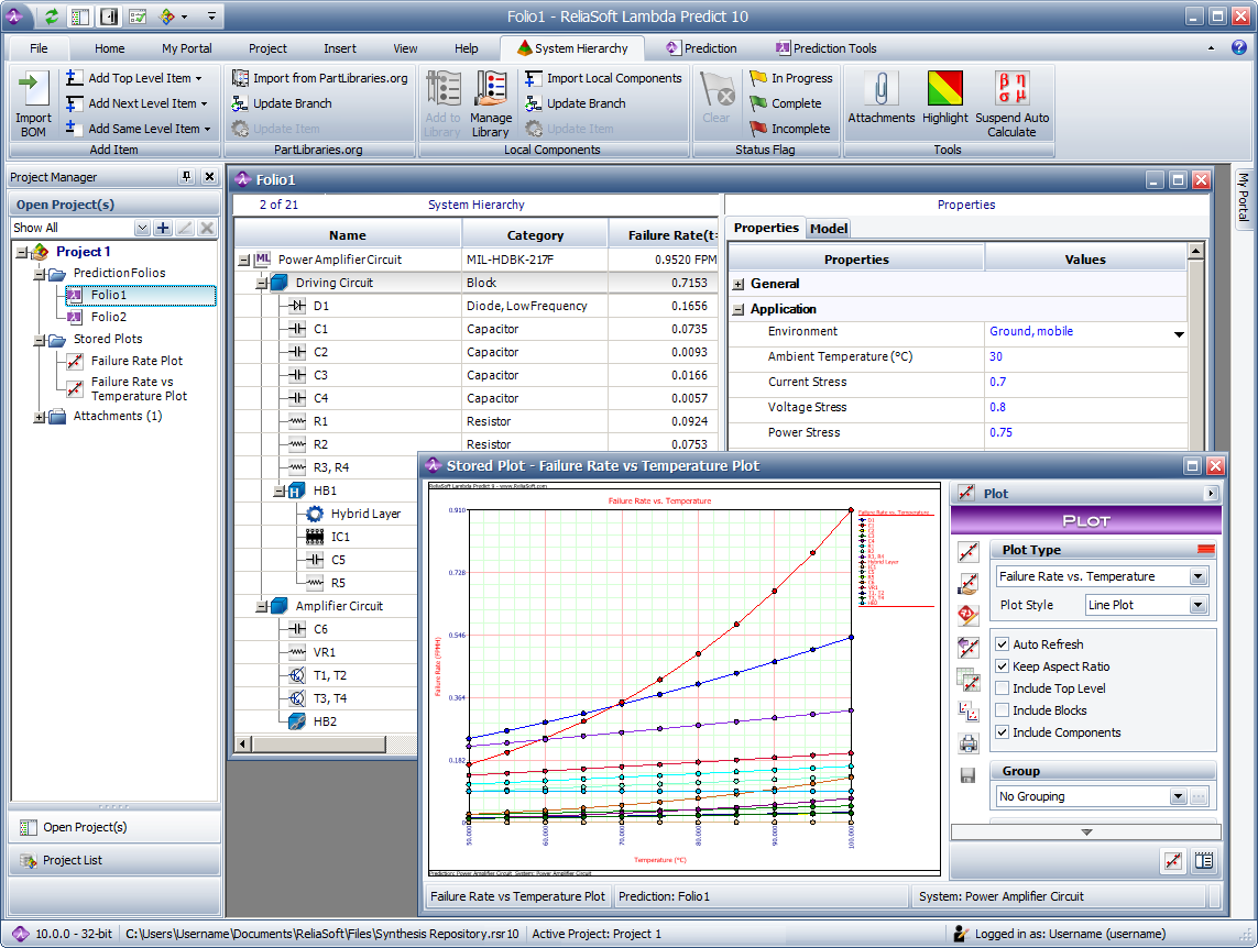 ReliaSoft’s Lambda Predict software provides a comprehensive platform for building and analyzing systems in accordance with published reliability prediction standards. Some of the many applications for using standards based reliability prediction techniques and Lambda Predict include the ability to: