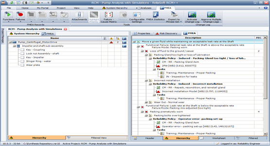RCM++ provides a flexible and intuitive interface for defining your system configuration and recording the functional failure analysis. The software tool includes configurable equipment selection, failure effect categorization and maintenance task selection capabilities. RCM++ also provides simulation-based calculations that can be used to compare the costs of potential maintenance strategies and a calculator to estimate the optimum maintenance interval for preventive repairs/replacements.