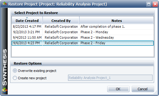 To learn more, open any of the Synthesis application help files and navigate to Working in Synthesis > Managing and Restoring Data > Restore Points. (Or click here to see the topic in the Weibull++/ALTA help file…)