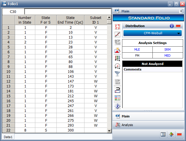 Step 2: Enter the data into the folio, using the Subset ID column to identify the failure mode. On the control panel, choose Competing Failure Modes > CFM-Weibull. Then select the MLE analysis method, as shown next.