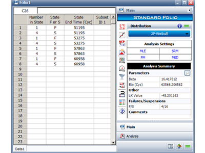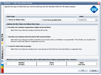 Step 1: Using Weibull++, the first step is to create a new standard folio for grouped times-to-failure (in cycles) with suspensions data.