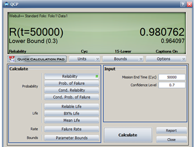 Step 3: The remaining task is to determine the demonstrated reliability at 50,000 cycles and at a 70% confidence level. The QCP in Weibull++ is used to compute this value, as shown next. In this case, the demonstrated reliability at the desired confidence level is found to be 96.41%, which is greater than the requirement, thus demonstrating the requirement.