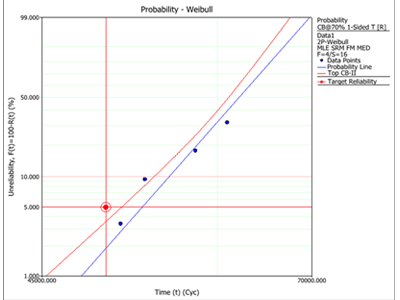 The reliability requirement for a new roller assembly is a reliability of 95% for 50,000 cycles at a 70% lower one-sided confidence level. The objective is to demonstrate this reliability goal through testing. The test lab at the manufacturing facility can test only 5 units at a time, so a test is set up for a sample size of 20 components (4 groups of 5 units each), to be run sequentially until the first failure in each group. In other words, the first group of 5 units is tested until one of the 5 units fails. After that, the second group is tested until the first failure and so forth.