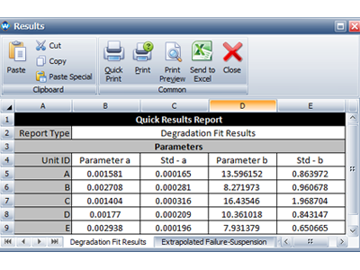 To view the parameters of the degradation model, click anywhere inside the Degradation Results area. The parameters will appear in the Results window, as shown next. (The second tab of the Results window shows the failure times that were extrapolated from the model.)
