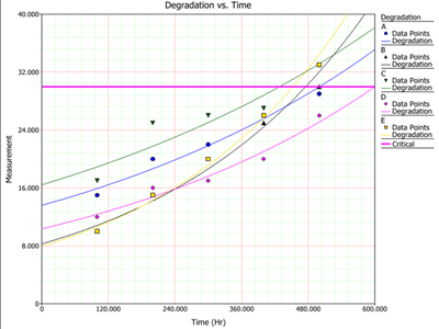 Step 2: Next, view the linear Degradation vs. Time plot for the degradation analysis, as shown next. This plot shows how each unit degraded over time, and the horizontal pink line indicates the level at which a unit is considered failed.