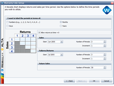 Step 1: Create a new warranty analysis folio using the Nevada data format. On the second page of the Warranty Folio Setup window, make the selections shown next.