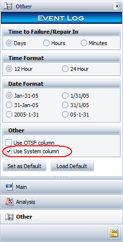 Step 1: Add an event log folio to an existing project by choosing Insert > Folios > Event Log. Once the folio is created, select the Use System column option on the Other page of the control panel, as shown. This will allow you to identify the system that experienced each event