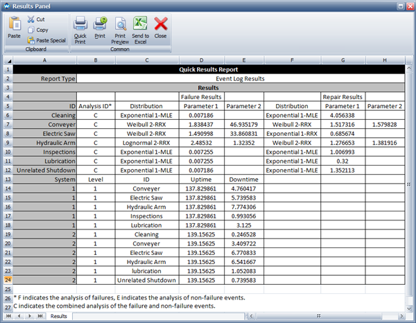 Step 6: Calculate the failure and repair distributions for the data set, then click anywhere inside the Analysis Summary area to display the results, as shown next.
